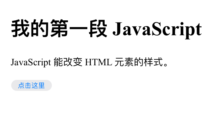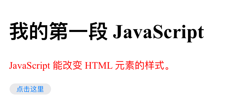 <h1>我的第一段 JavaScript</h1> <p id="demo"> JavaScript 能改变 HTML 元素的样式。 </p> <script> function myFunction() { x=document.getElementById("demo") // 找到元素 x.style.color="#ff0000"; // 改变样式 } </script> <button type="button" onclick="myFunction()">点击这里</button> -
