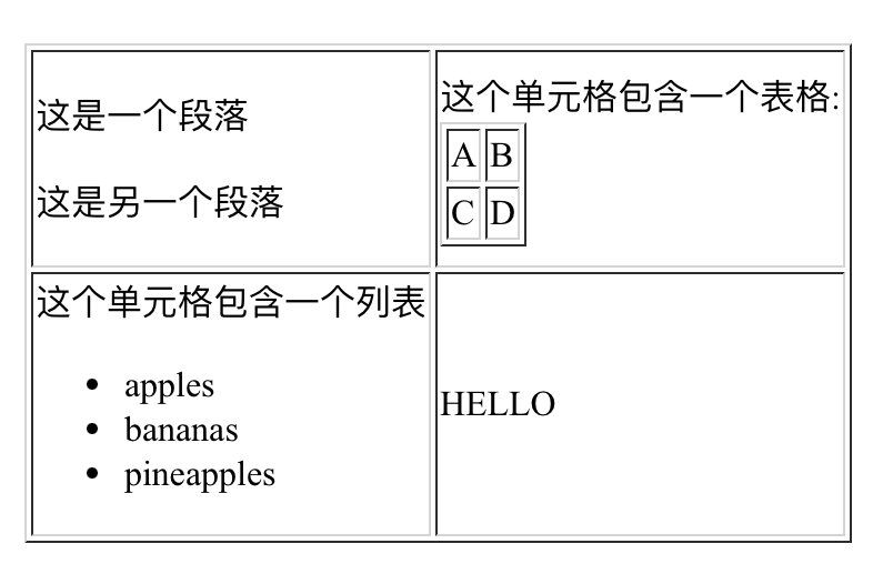 - 元素可包含普通 HTML 页面的 body 元素中能够找到的所有元素
